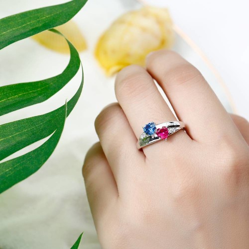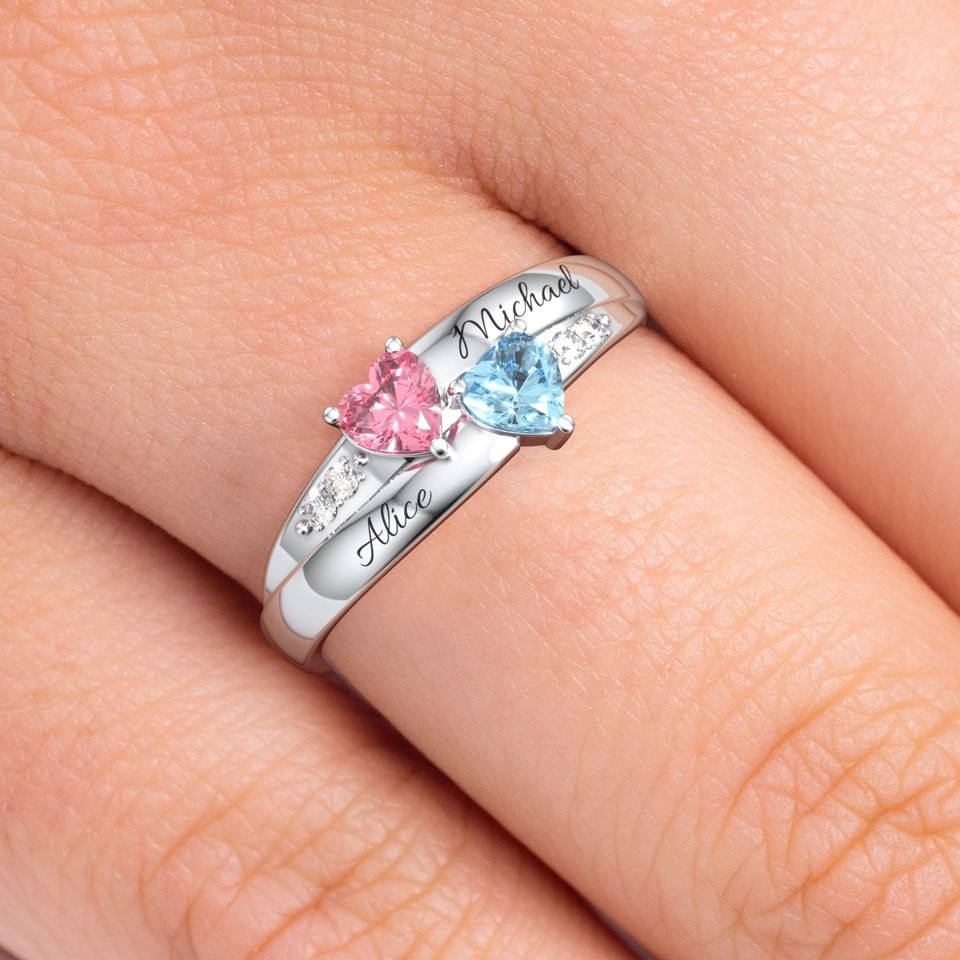 Bague de promesse de pierre de naissance double coeur gravée sur mesure en argent sterling S925 pour elle